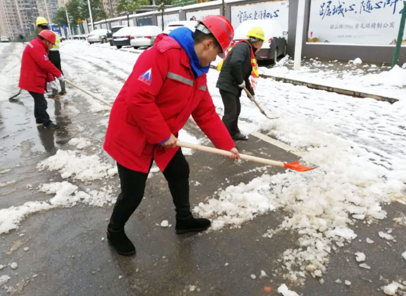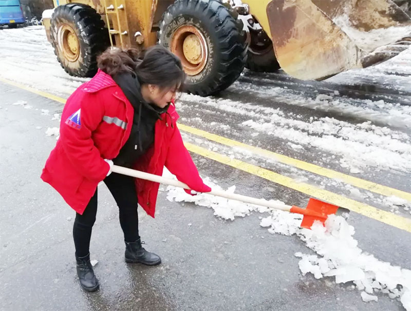 有想法就付諸于行動(dòng),簡(jiǎn)短交流后,員工們開(kāi)始有效的分工安排,開(kāi)裝載機、拿鐵鍬、用掃帚、撒工業(yè)鹽、保障物資等,默契合作。
